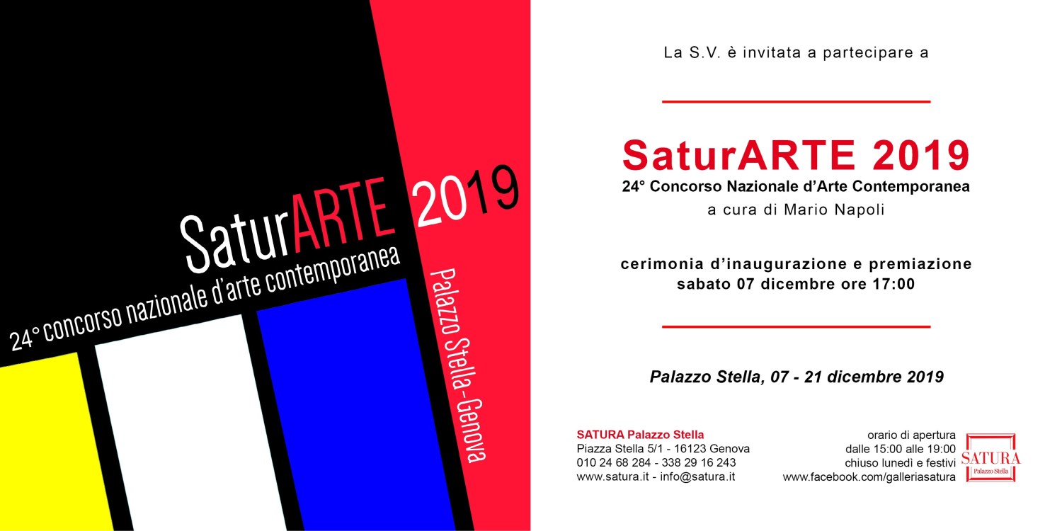 L’inaugurazione del 24° Concorso Nazionale d’Arte ContemporaneaSaturARTE 2019, a cura di Mario Napoli, si svolgerà sabato 7 dicembre 2019 alle ore 17:00, presso Palazzo Stella, a Genova.
