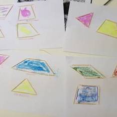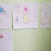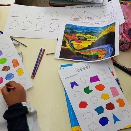 Terminata l’attività di descrizione dell’opera, l’insegnante passa alla successiva attività, che coinvolge le discipline logico-matematiche. Si lavorerà infatti sulle figure geometriche, centrandosi in particolare sui poligoni regolari e irregolari, argomento illustrato qualche settimana prima. Chiede agli alunni cosa sia un poligono, precisamente la definizione geometrica di poligono; chiede la distinzione tra poligoni regolari e irregolari con le relative definizioni e classificazioni.