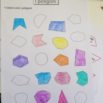 Inoltre gli alunni così facendo hanno l’opportunità di consolidare il “concetto di poligono”. Dopo aver illustrato alla classe il fine di questo percorso, l’insegnante fa svolgere agli alunni una nuova attività, consegnando loro una scheda didattica che illustra diverse figure geometriche e chiedendo loro di colorare soltanto le figure che rappresentano dei poligoni.