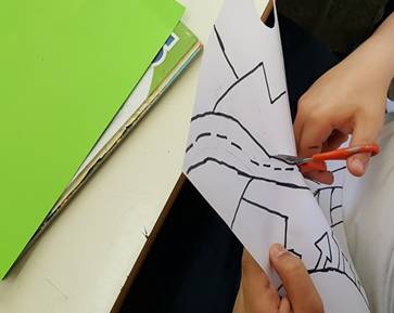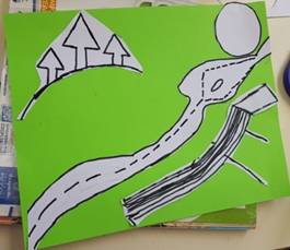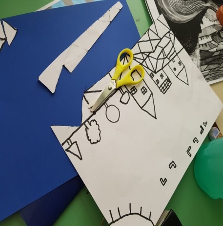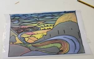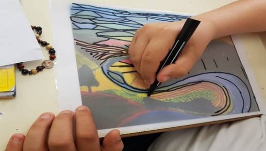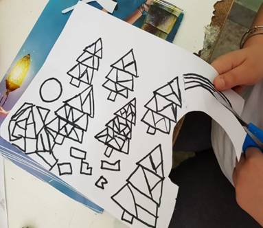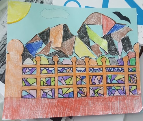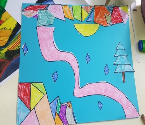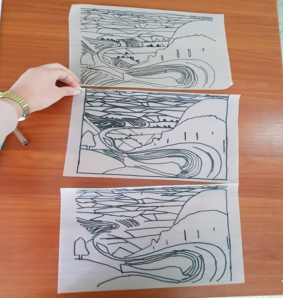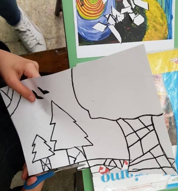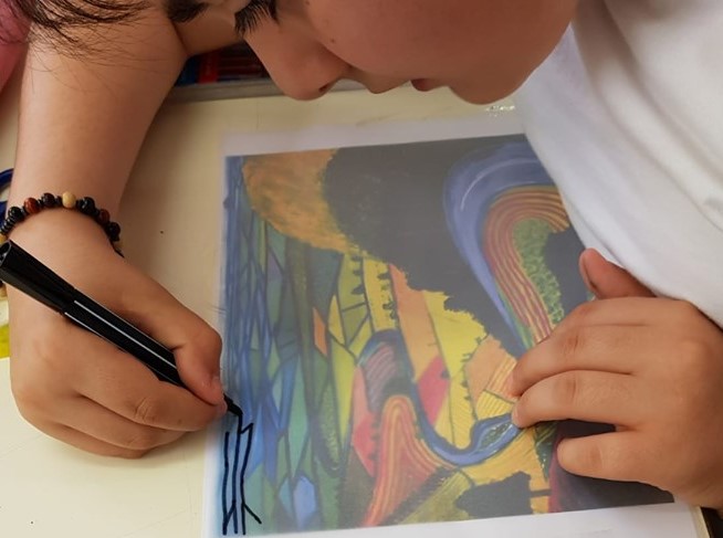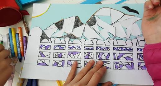 Al termine dell’attività, che ha divertito molto gli alunni, l’insegnante consegna a ciascun alunno una copia dell’opera d’arte con un foglio lucido; fa poi ricopiare su foglio lucido con un pennarello nero l’opera, attraverso le linee di forza e le figure geometriche che compongono il paesaggio.