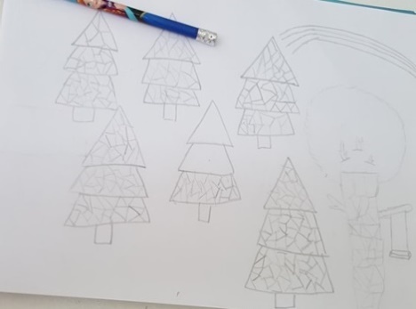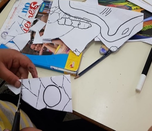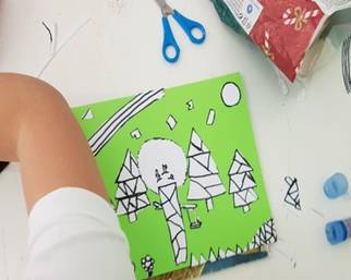 Successivamente consegna agli alunni un foglio a4 dicendo loro che dovranno realizzare, ispirandosi all’opera di Hockney, un paesaggio dagli elementi a forma geometrica. Dovranno dapprima disegnare sul foglio a 4 in maniera del tutto scomposta i diversi elementi paesaggistici (alberi, strade, colline, case, etc.) che hanno immaginato come parti costituenti del loro paesaggio, poi ripassarne i contorni col pennarello nero. Dopo aver disegnato il paesaggio in maniera del tutto “scomposta” e averne ripassato i contorni di nero, chiede agli alunni di ritagliare le singole parti. Consegna agli alunni dei cartoncini colorati e dice loro di “ri-comporre” il loro paesaggio sul cartoncino, così come lo hanno immaginato, incollando i diversi elementi di riferimento. Dopo aver composto il loro paesaggio, i bambini lo colorano ispirandosi alla Pop Art, dunque con grande vivacità cromatica, utilizzando colori a cera, pastelli, pennarelli e polverine di brillantini colorate, dando libero sfogo alla loro creatività e immaginazione.