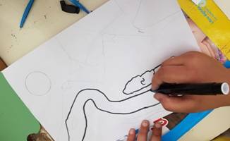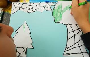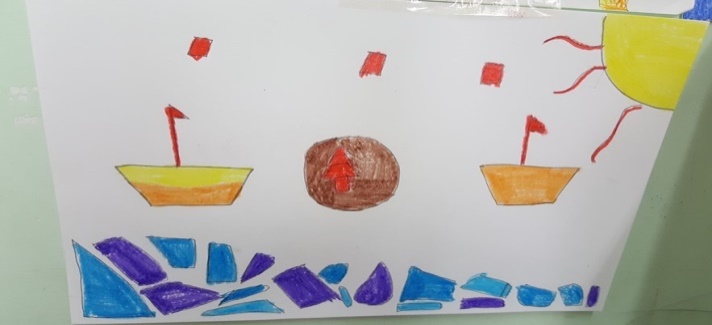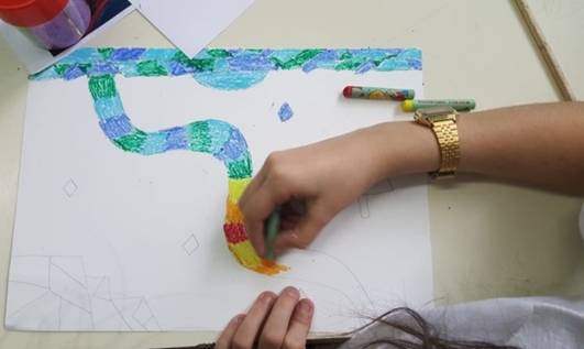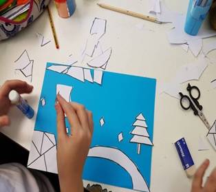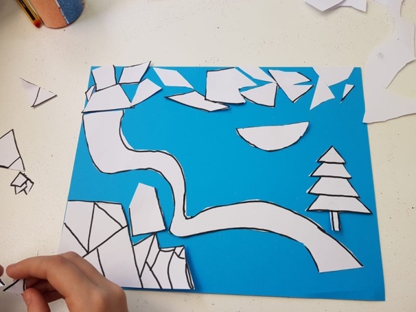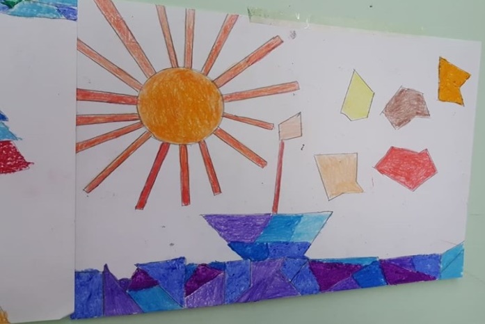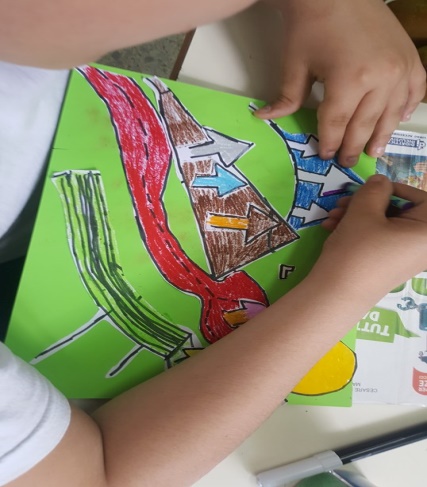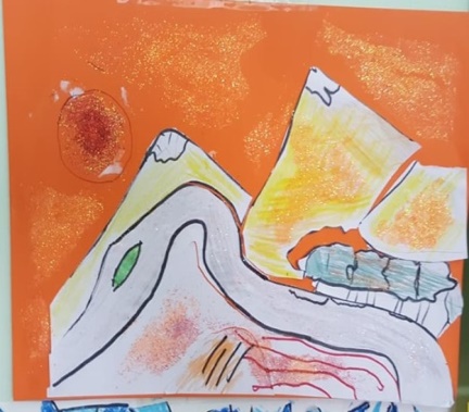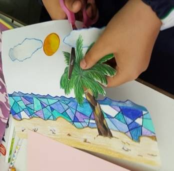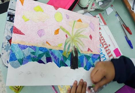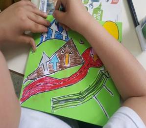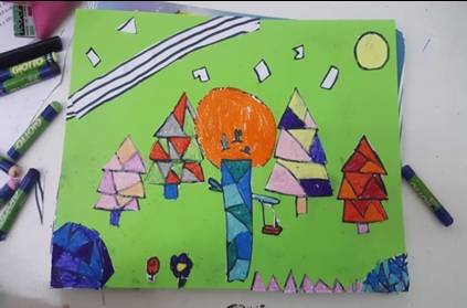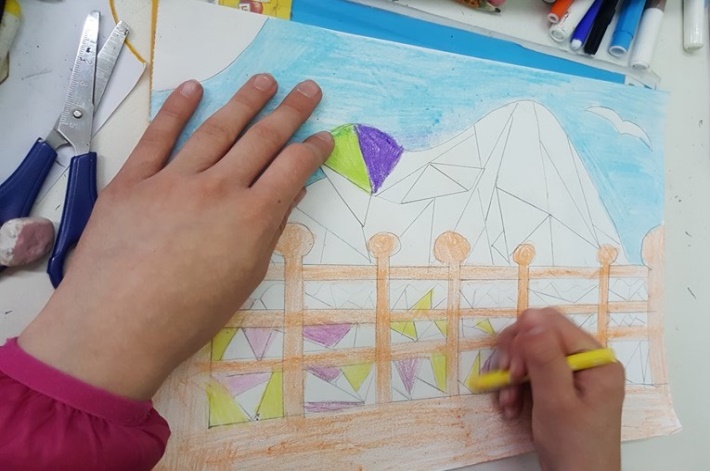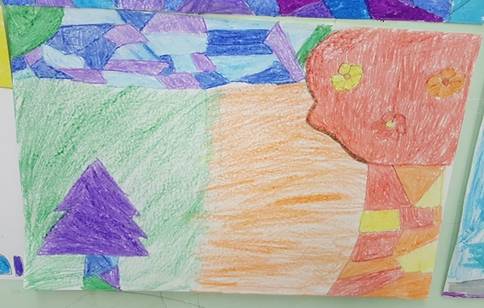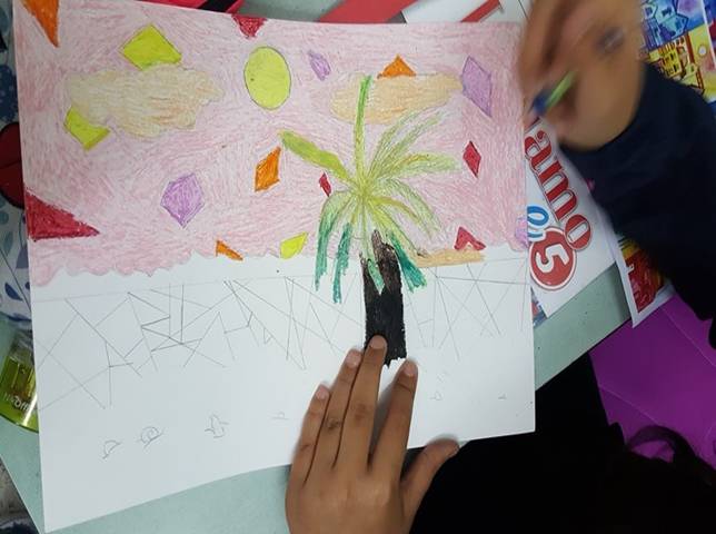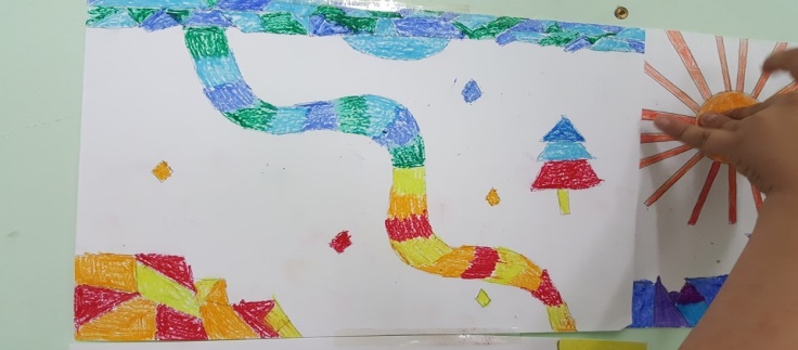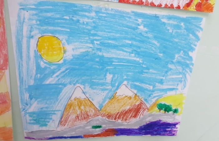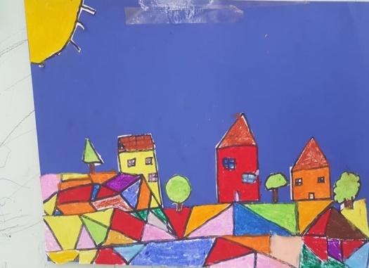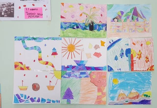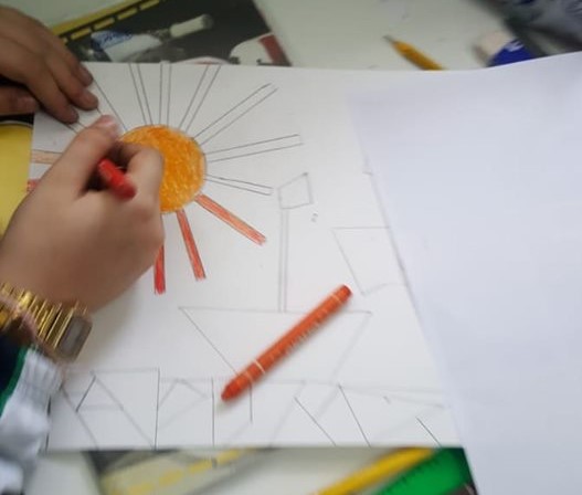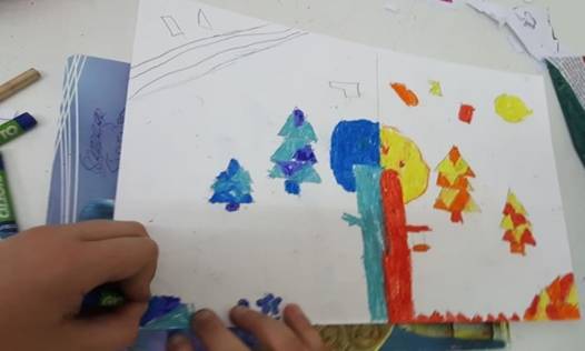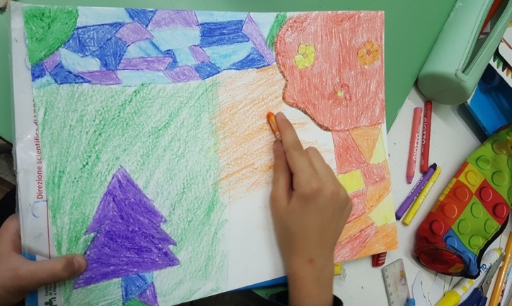 Successivamente l’insegnante incuriosisce gli alunni, dicendo loro che un paesaggio può cambiare il suo aspetto non solo con l’aggiunta dei suoi elementi caratteristici, bensì anche attraverso l’uso del colore da parte dell’artista, con l’utilizzo di sfumature e soprattutto dei vari contrasti tra colori come il contrasto chiaro-scuro, il contrasto caldo-freddo, il contrasto di colori complementari, il contrasto di colori primari e secondari e così via. Pertanto, approfondisce il contrasto di colori caldi e freddi. Quindi il percorso continua con la produzione di un altro disegno: l’insegnante distribuisce agli alunni un foglio Fabriano liscio a4, chiedendo ai bambini di disegnare, a mano libera e con tratto morbido, lo stesso paesaggio realizzato precedentemente e ottenuto dalla composizione delle figure geometriche e degli altri elementi sul cartoncino colorato. Infine, una volta terminato il disegno del paesaggio, l’insegnante chiede agli alunni di colorarlo con i colori a cera utilizzando il contrasto colori caldi-colori freddi; in tal modo gli alunni sperimentano, attraverso il “learning by doing”, l’uso del colore.