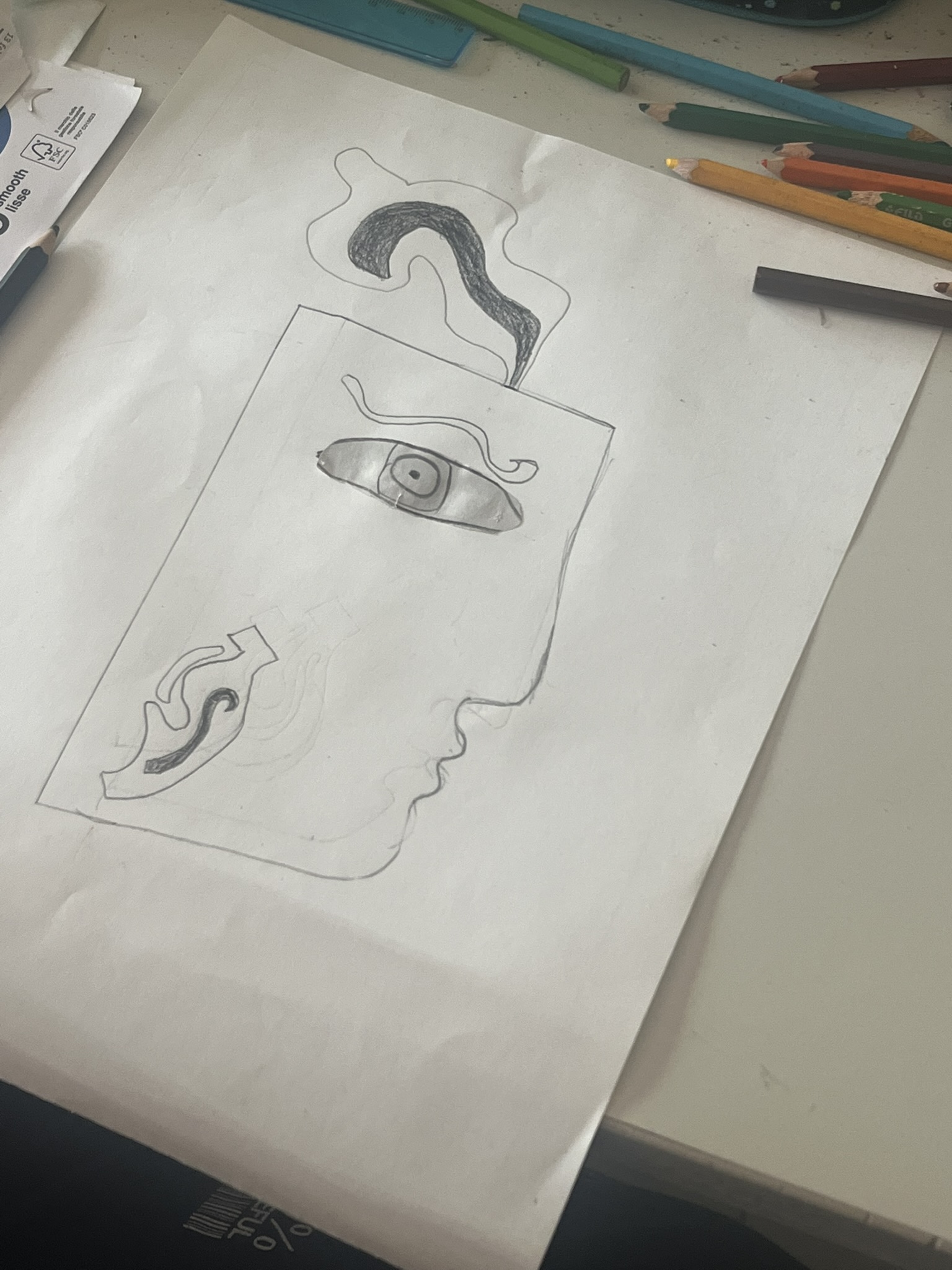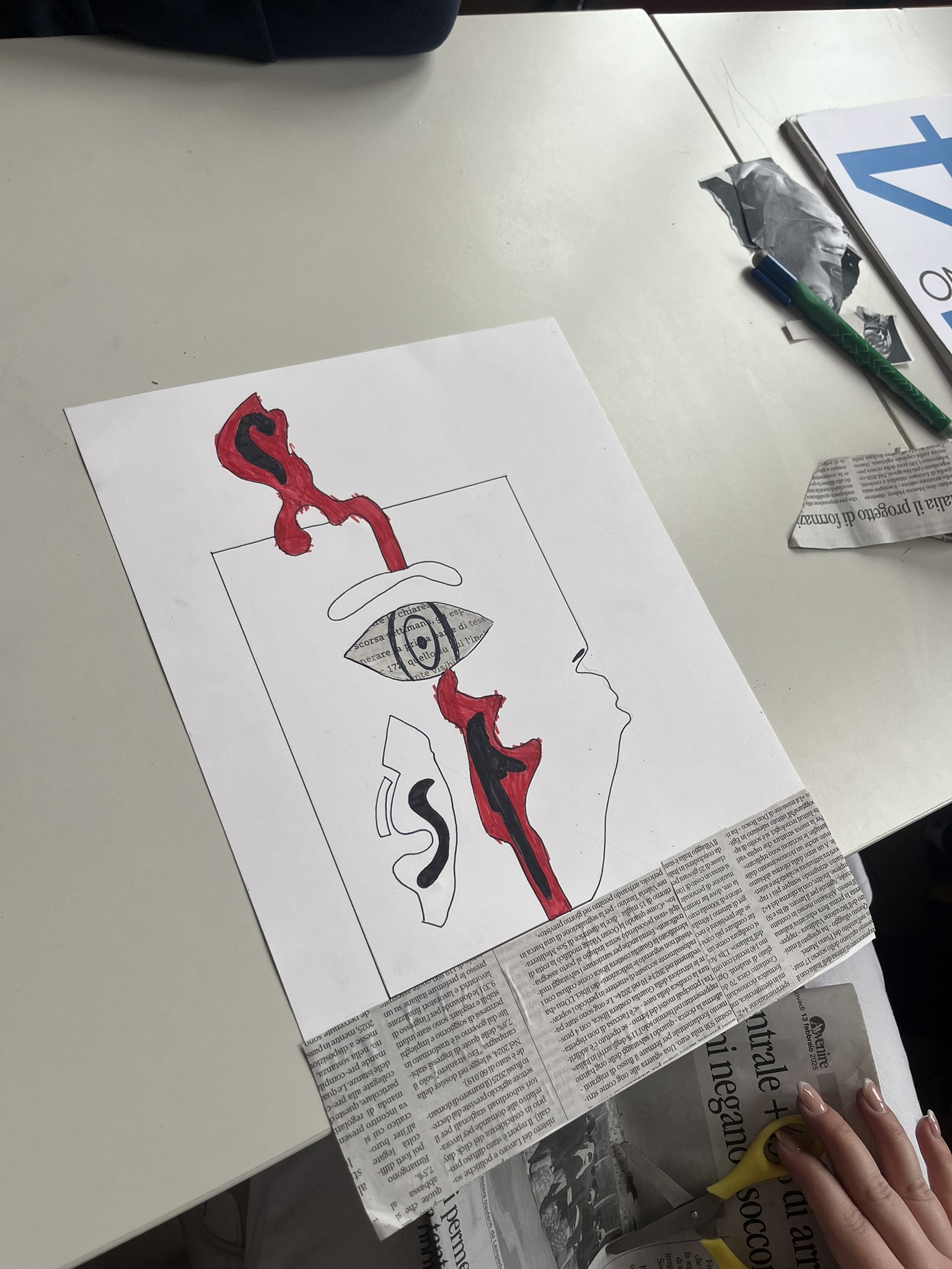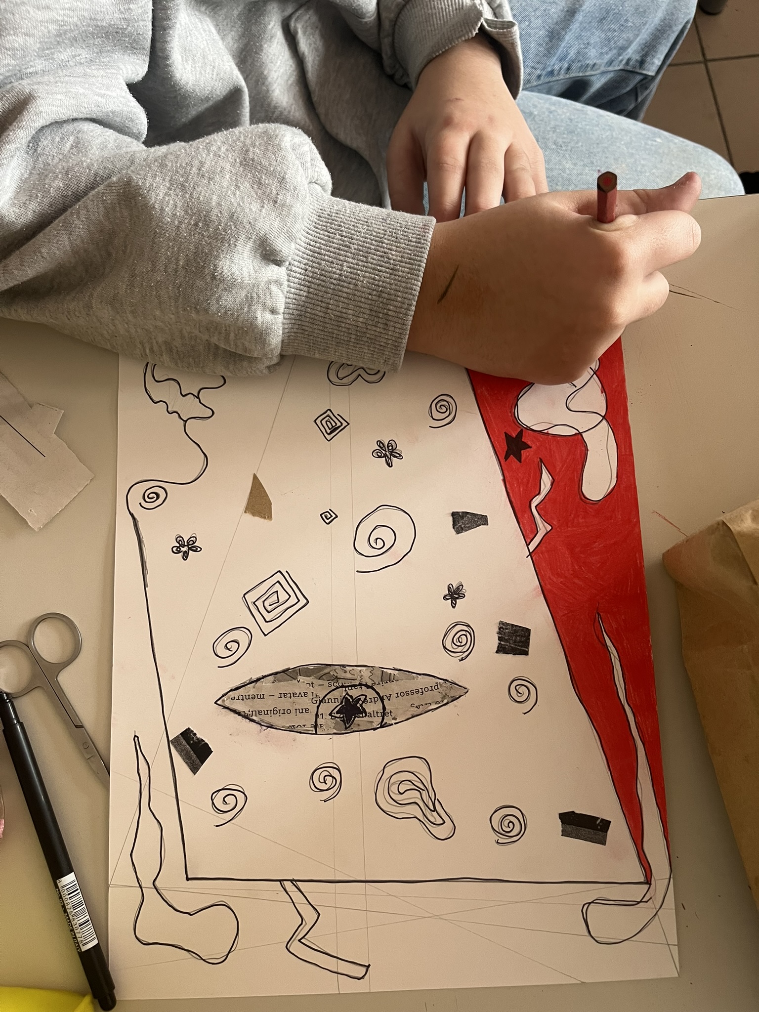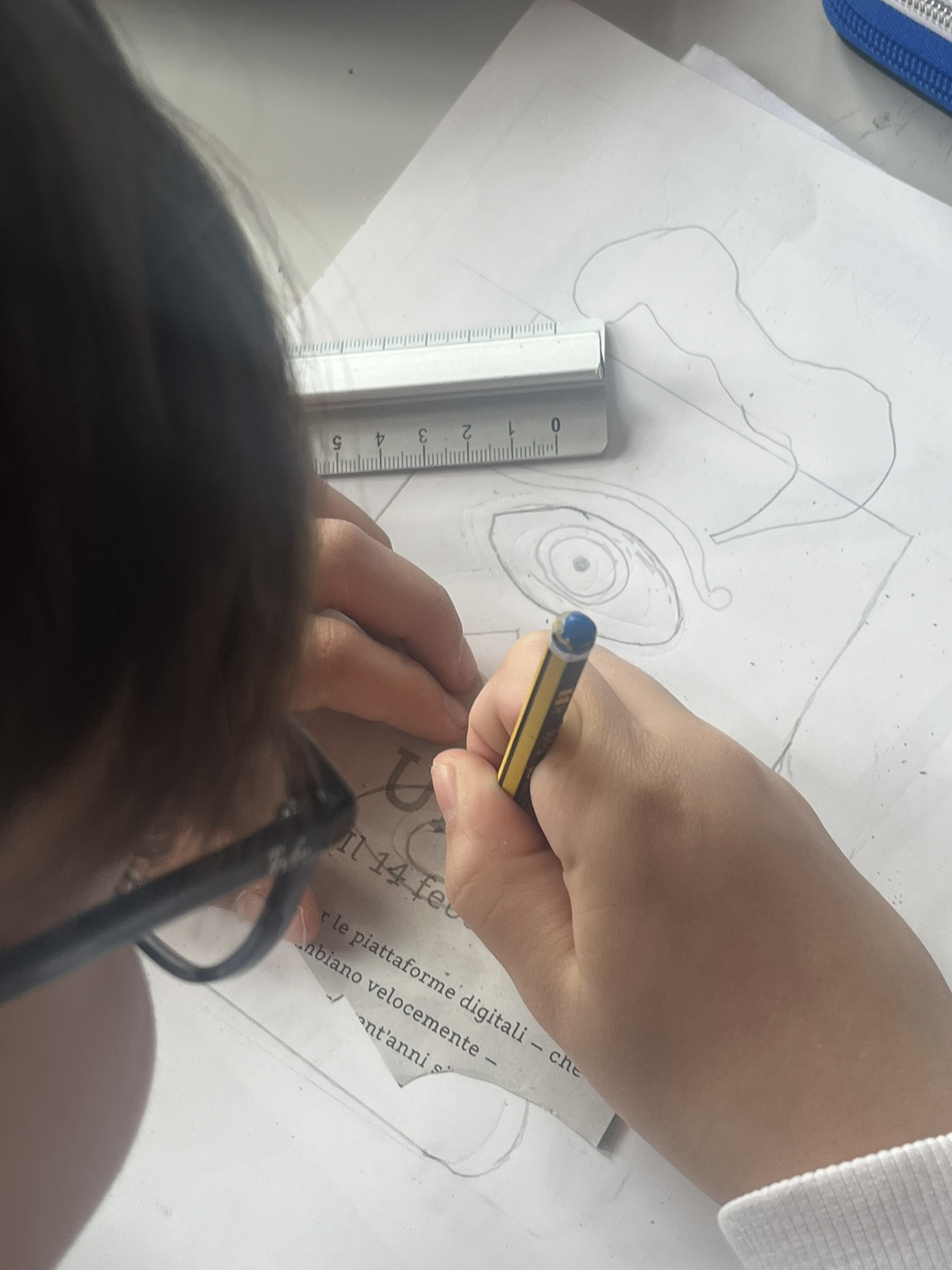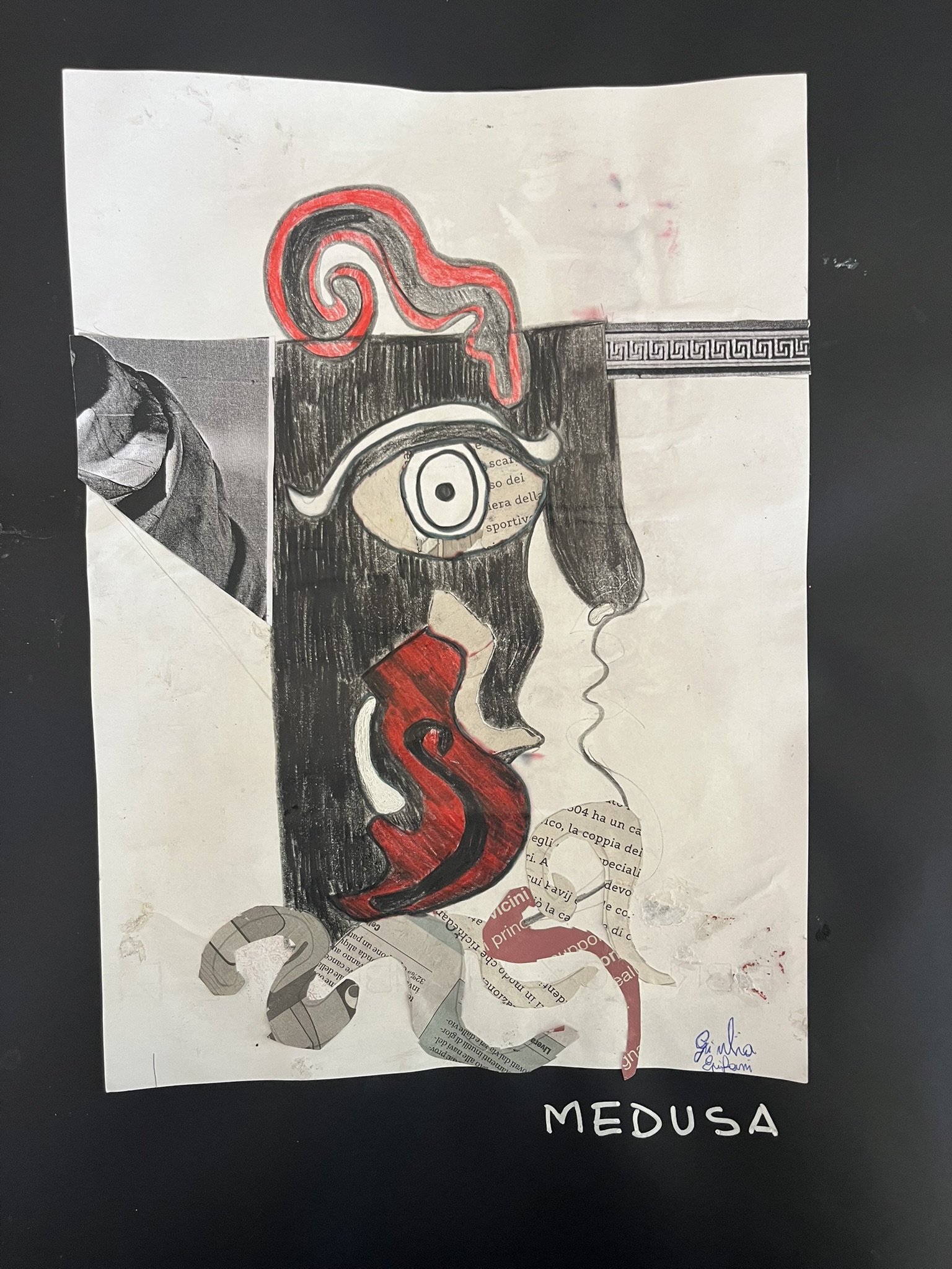 I miti analizzati includono Icaro, Aracne, e figure connesse allo studio dell’Iliade e dell’Odissea. Abbiamo tratto ispirazione dalla storia dell’arte, in particolare dalla pittura vascolare del periodo arcaico e classico, per esplorare le modalità rappresentative utilizzate nell’antichità. Gli studenti hanno estrapolato i profili delle immagini ingrandite dei vasi e li hanno ridisegnati liberamente, nelle ore dedicate alla pratica. La rappresentazione finale è stata realizzata con la tecnica del collage, impiegando materiali di riciclo come, giornali, cartoncino, tessuti, bottoni, piume, lana, etc. Questi elementi hanno contribuito a personalizzare le rappresentazioni dei personaggi mitologici, tra cui Medusa, Eris, Afrodite, Icaro, Polifemo, Zeus, Era, ecc.